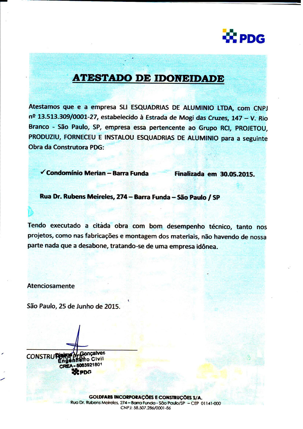 Atestado de Idoneidade e Entrega de Obra